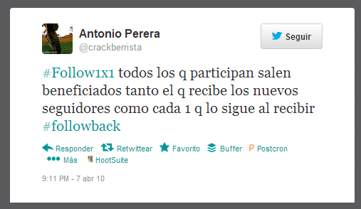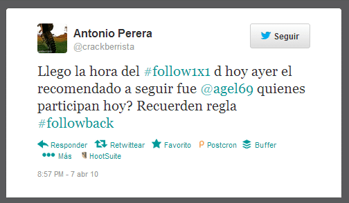 - #Follow1x1: es un HT que @Crackberrista empezó a promover a principios del 2010. Las reglas consistían en que él recomendaba seguir a 1 tuitero y esa persona se comprometía a dar follow back a quienes le sigan. Personalmente, creo que una parte de la idea no era tan mala, al final de cuentas tú decidías si seguir o no a esa persona que él recomendaba. Donde el asunto se complicaba es que esa persona debía seguir (prácticamente por obligación) a todos los que le siguieron luego de la recomendación. El tema se puso aún más feo cuando TODO EL VIVO empezó a usar el HT de forma indiscriminada y a seguirse unos con otros sin ningún criterio razonable, solo para tener más followers.
