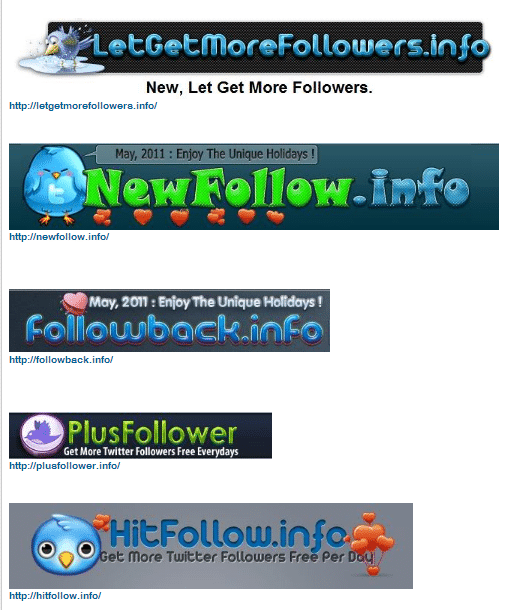 Desde hace mucho tiempo, Internet está lleno de mecanismos y páginas que supuestamente te ayudan a conseguir followers masivamente. De hecho, si escribes en Google «More followers on Twitter» tendrás un montón de opciones para lograrlo. Aquí te digo unas cuantas: